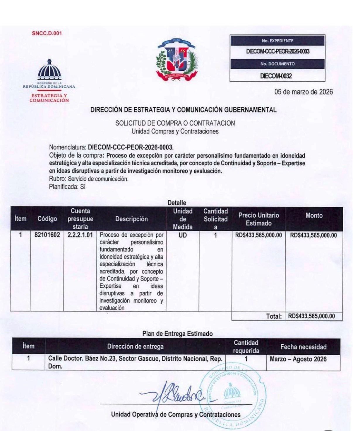 SANTO DOMINGO.- El Partido de la Liberación Dominicana (PLD) consideró escandaloso que de la Dirección de Estrategia y Comunicación Gubernamental (DIECOM) «se canalice» un contrato para el monitoreo de medios por un monto de 433 millones 565 mil pesos.