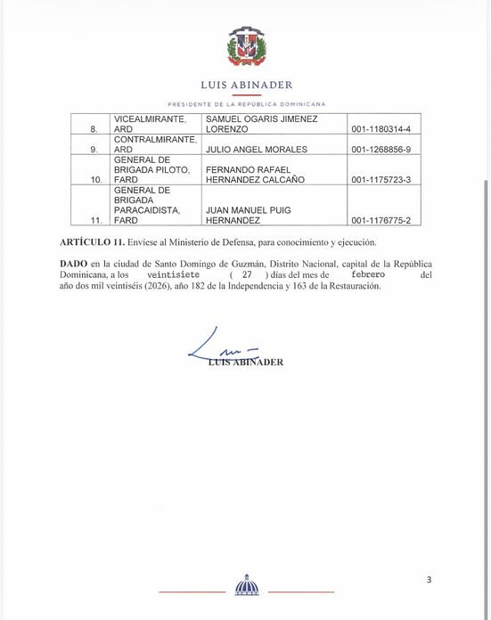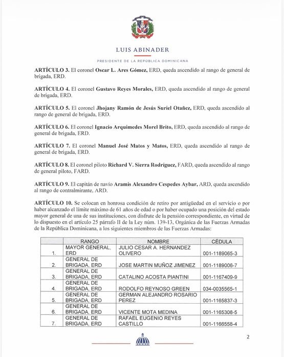 Mediante la disposición, el mandatario ascendió al rango de general de brigada, ERD, a los coroneles Guillermo Jiménez Arciniega, Oscar L. Ares Gómez, Gustavo Reyes Morales, Jhojany Ramón de Jesús Suriel Otañez, Ignacio Arquímedes Morel Brito y Manuel José Matos y Matos. Asimismo, fue ascendido a general médico, ERD, el coronel médico Tomás Rafael Brache Ovalles; a general piloto, FARD, el coronel piloto Richard V. Sierra Rodríguez; y a contralmirante, ARD, el capitán de navío Aramis Alexandro Céspedes Aybar.